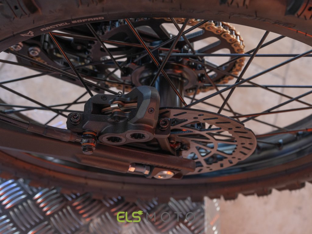 Zintegrowany akumulator 72 V / 55 Ah (≈3,96 kWh) należy do największych w klasie „compact e-enduro”. W trybie stałej prędkości 50 km/h osiąga zasięg do 135–160 km (w zależności od stylu jazdy, terenu i temperatury). Regulowana rekuperacja wydłuża zasięg i odciąża hamulce podczas zjazdów.